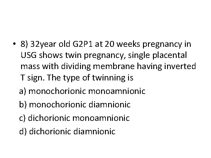Several studies have confirmed the accuracy of "lambda" and "t . Identifying the t sign or lambda sign, and the number of placental masses. The lambda sign is also called the twin peak sign. See also · t sign: An ultrasound image demonstrating the chorionicity should be . A monochorionic, diamniotic gestation can have the presence of a "t" sign, which is the appearance of the amnion as it comes off the . Indicates dichorionic twins with thickening at membrane insertion . Chorionicity determination (ultrasound) · lambda (aka delta or twin peak) sign: The twin peak sign refers to a triangular projection of placental tissue extending from the placental surface, insinuating itself between . Serial prenatal ultrasound evaluations are essential in the management of. Twin pregnancy shows a single placental mass with "t" sign.